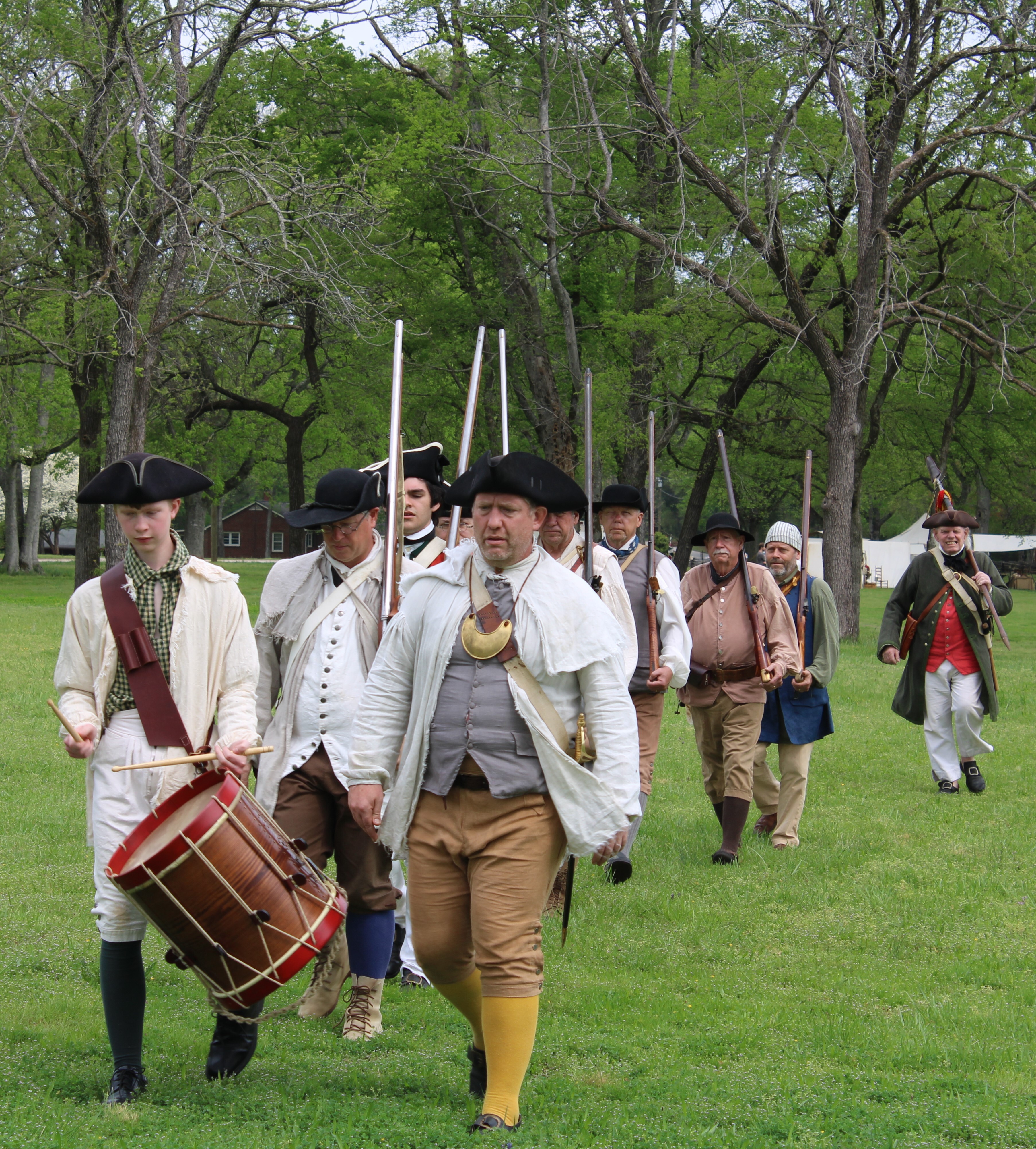 Men in colonial clothing with muskets lead by a drummer.