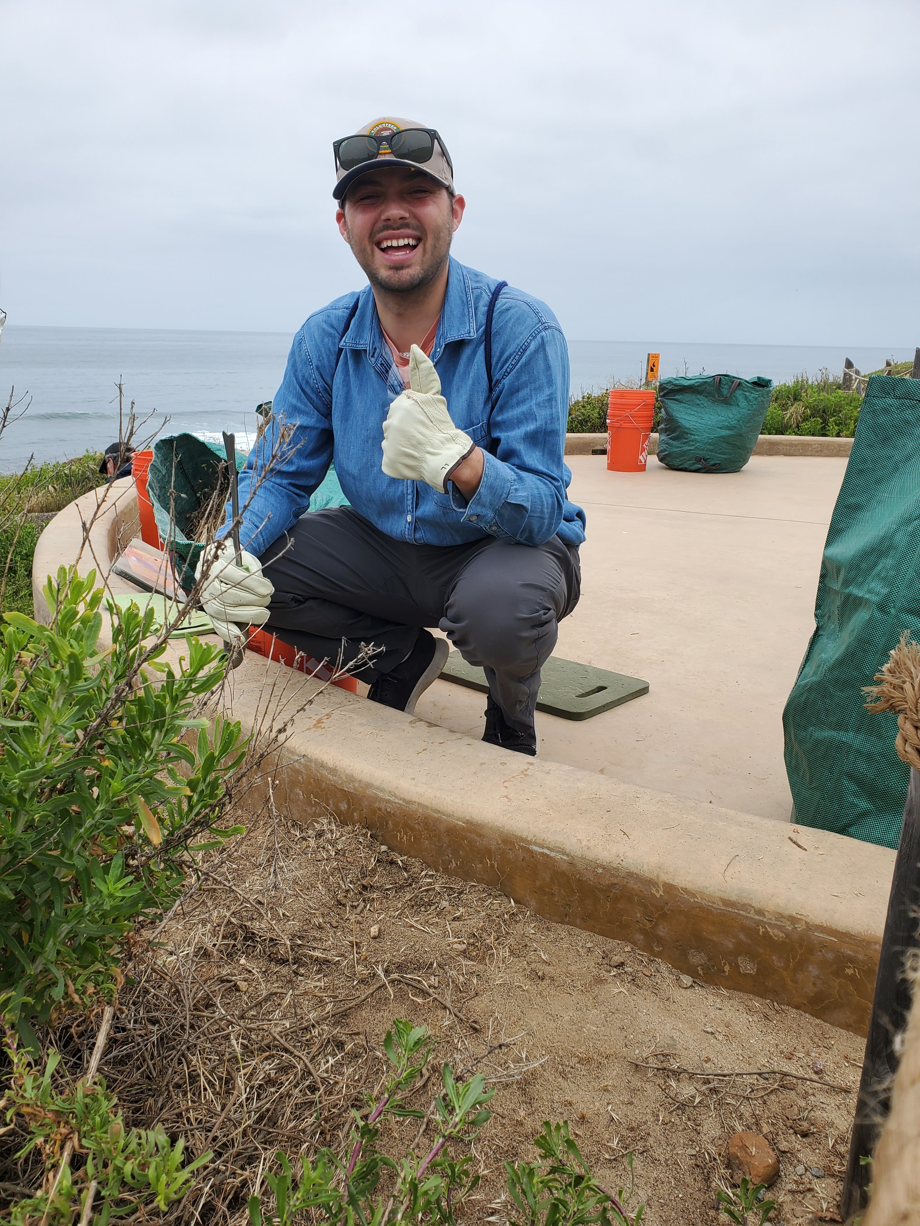 Weed Warriors (Habitat Restoration) volunteer gives a thumbs up as he kneels next to a newly restored segment of the Coastal Trail. Behind him is the gray Pacific Ocean and cloudy sky, along with the equipment of other volunteers.