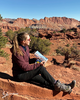 Surrounded by cliffs and trees, a person sits on a rock, holding a small watercolor paper book and paint set.