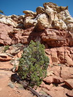 Small, dark green tree covered in pale blue berries, with red and white striped cliffs above it.