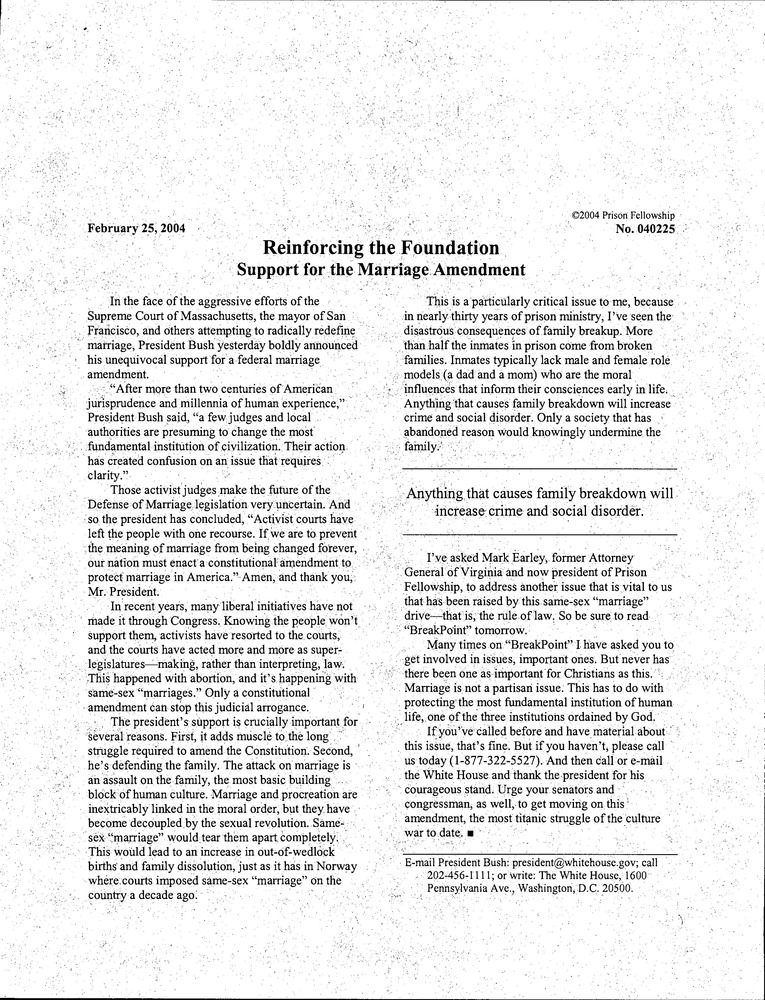BreakPoints article shared from BJ Goergen to Karl Rove titled "Reinforcing the Foundation: Support for the Marriage Amendment'"