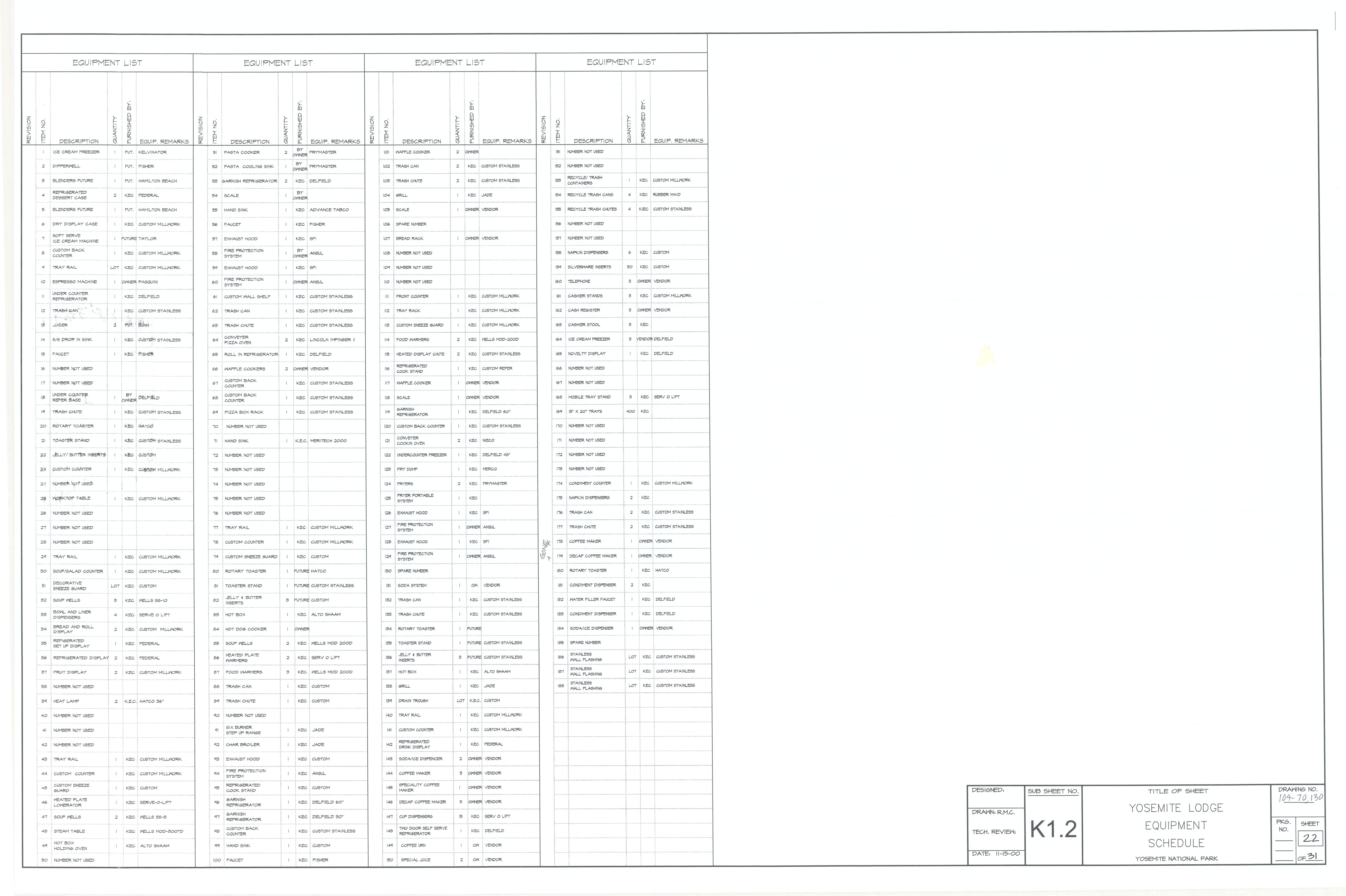 Food Service - Equipment Schedule (Items 1-188)