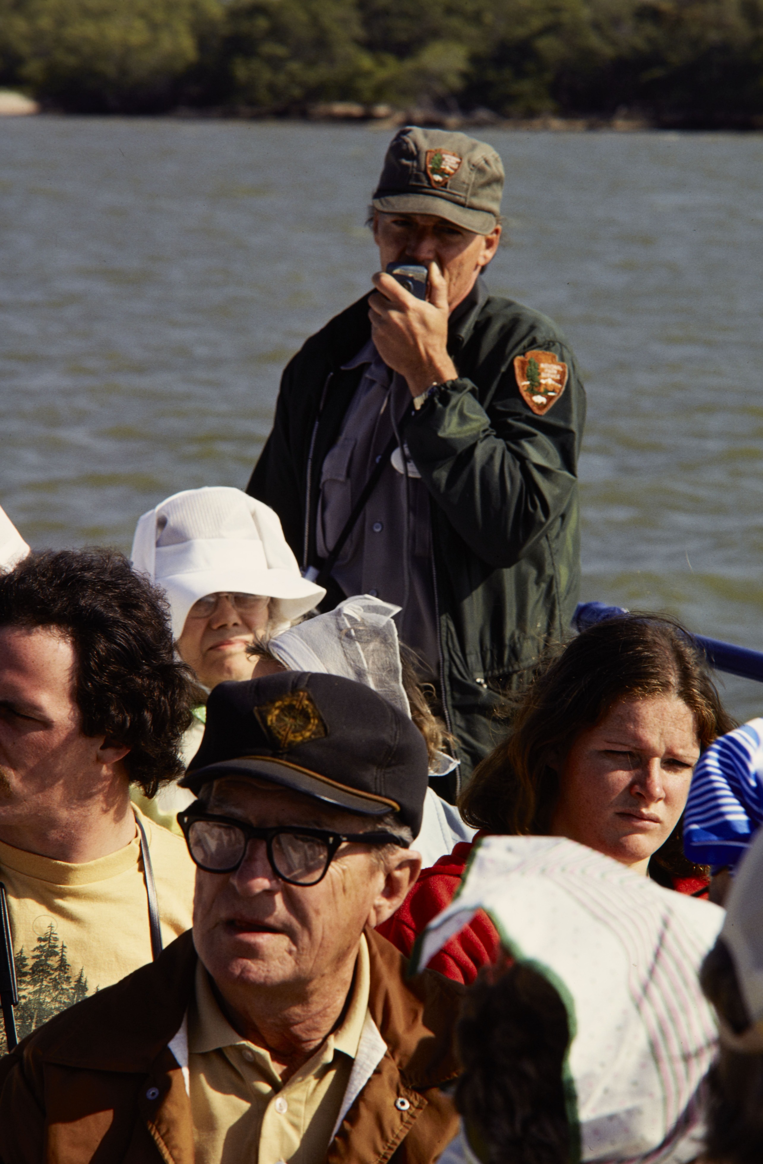 NPS employee talking visitors in a boat through a microphone in Everglades National Park.