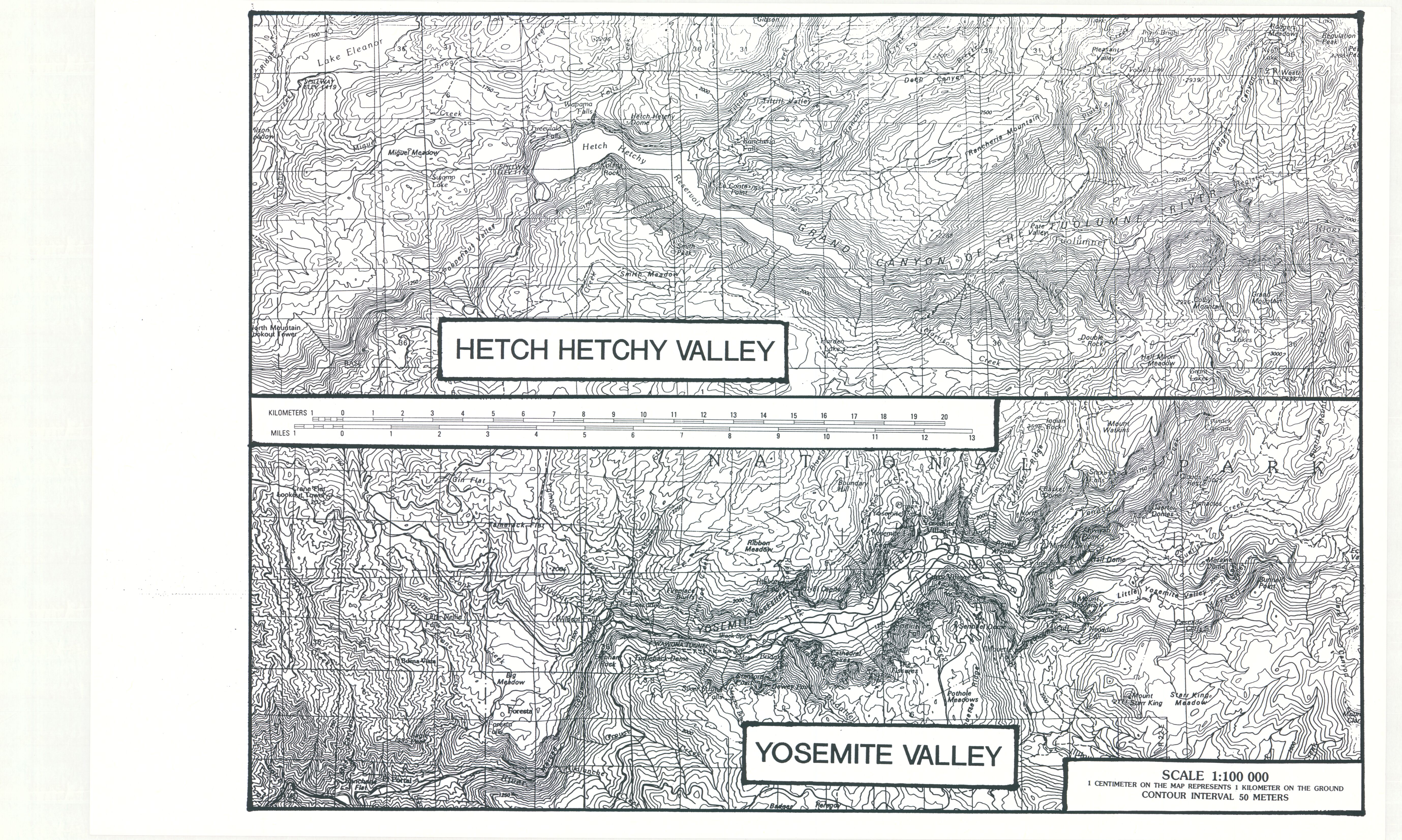 Aerial view topographic map showing Hetch Hetchy Valley and Yosemite Valley