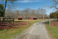 Two red barns in a grassy area with a wooden gazebo and red fence in the foreground.