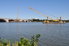 Construction on Arlington Memorial Bridge in September 2019. A crane is being driven to the bridge by a barge. The Lincoln Memorial and Washington Monument are in the background.