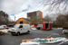 A white van is parked and surrounded by siding that is piled up on the ground. In the background, the entire back wall of the center is missing siding or still has old, dark brown siding.