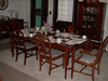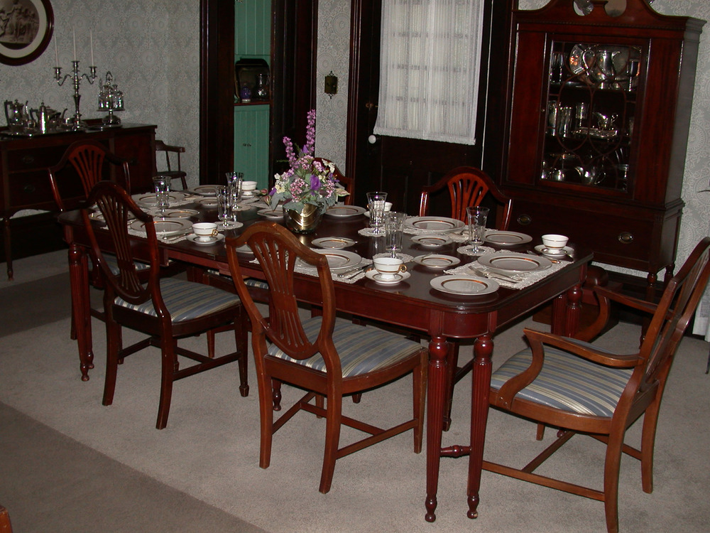 Formal dining room table, with full settings in place. Flower centerpiece. A cabinet contains several Gates/ Wallace and Truman mementos.