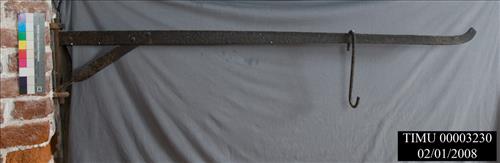 Swival fireplace crane used to hang pots from for cooking and various household<CRpurposes. Long metal arm narrows and curves upward toward the right-side end;left-side end<CRof arm forged at a right angle to the top of a short metal bar; a third bar forms an angle<CRd brace, forged at one end to the bottom of the short bar, and attached by fasteners at it<CRs opposite end to the arm. The short bar has rounded ends which swivel between 2 rings att<CRached vertically to the left side of the fireplace, making a swivel fireplace crane.