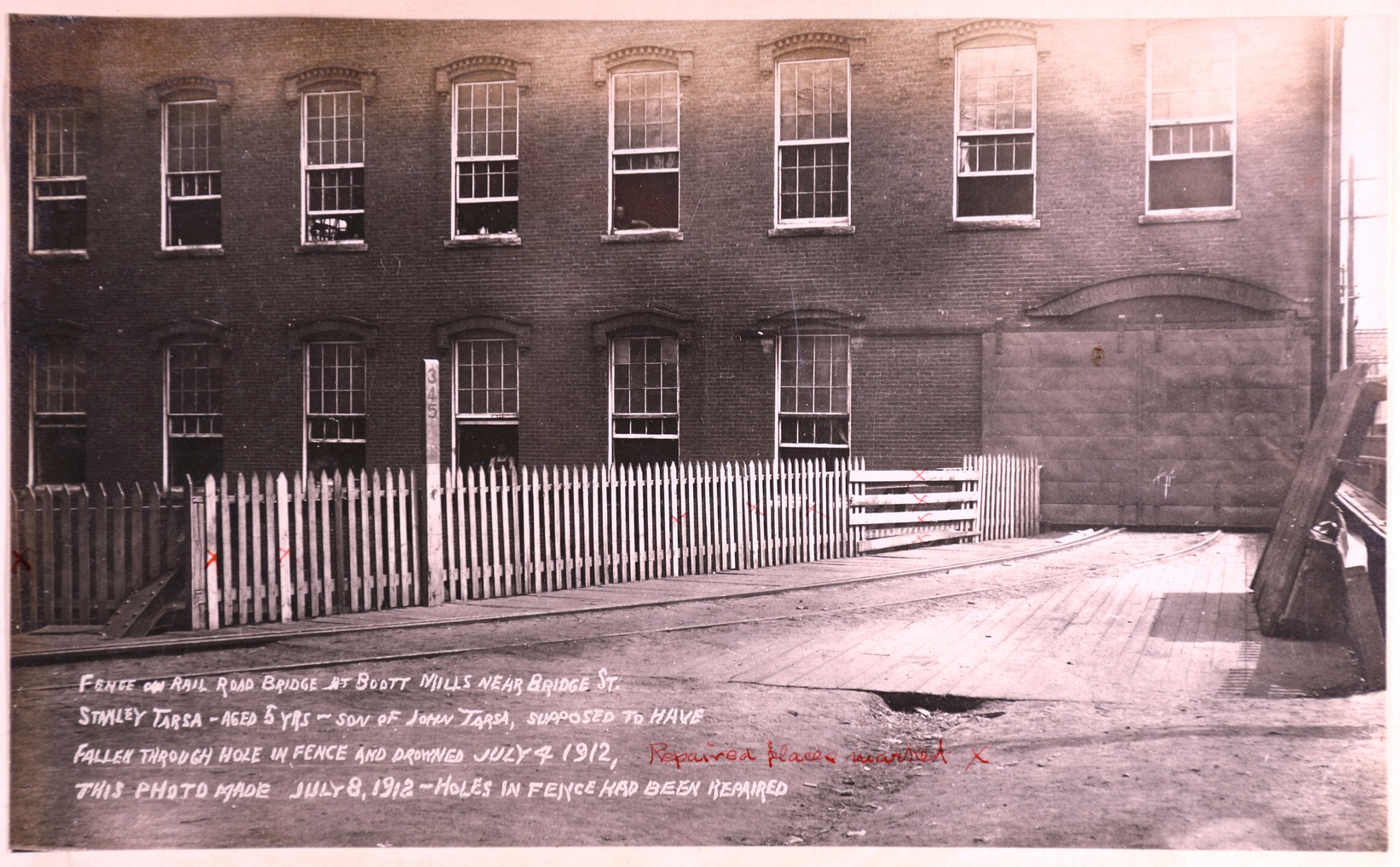 It was evening on July 4, 1912, when 5-year-old Stanley Tarsa was last seen playing in the street near his home. When neighbors heard a splash in the nearby Eastern Canal, they rushed to the scene. Too late. Stanley was a typical Lowell youth of the day. His parents were immigrants, from Poland. His father was a weaver. They rented an apartment in what had once been a mill girl boardinghouse across the canal from Boott Mill. Within a few days of the accident, Locks and Canals boarded up the hole in the bridge fence. That bridge still exists. In 1912, it provided rail access to the Boott Mills coal bunker. Today, that space is the trolley barn, where Lowell National Historical Park maintains its historic trolleys and makes sure that the canal fence is in good repair.