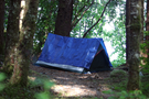 A small tent with a blue tarp draped over it sits in a clearing between trees.