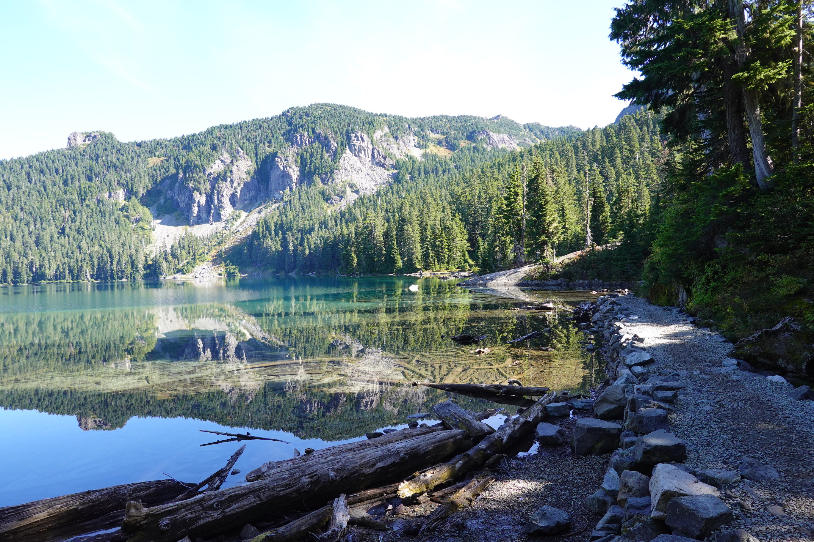 A trail skirts the south side of Mowich Lake near the main parking area.