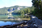 A raised rocky path skirts the edge of a large mountain lake framed by forested hillsides.
