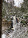 Miners Falls flows out of a lightly snow coated evergreen forest and over a cliff.