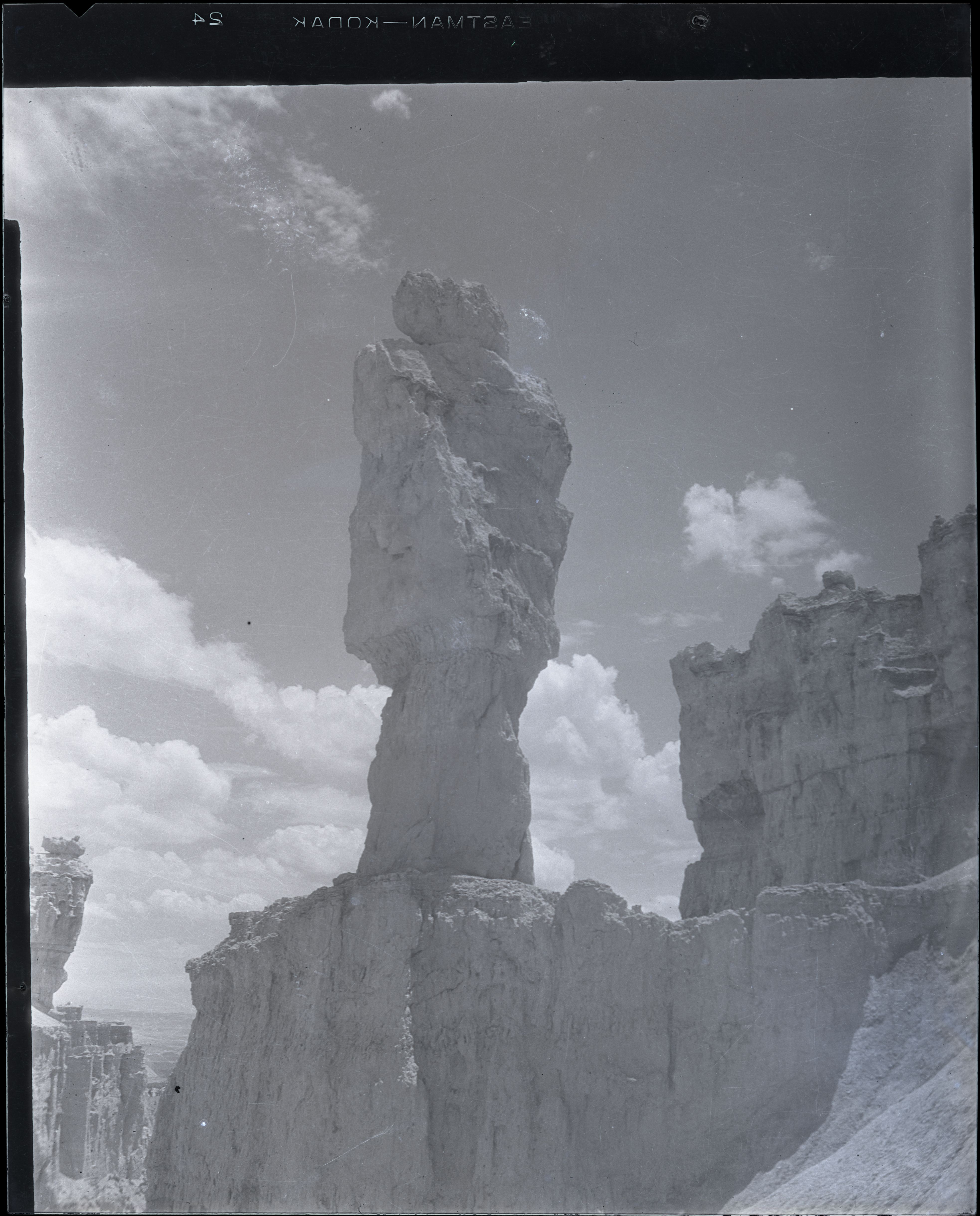 Nitrate negative of solitary hoodoo on rock formation below the rim in BRCA. ; BRCA Museum and Archives Image BRCA8875_001_136 ; BRCA 8875