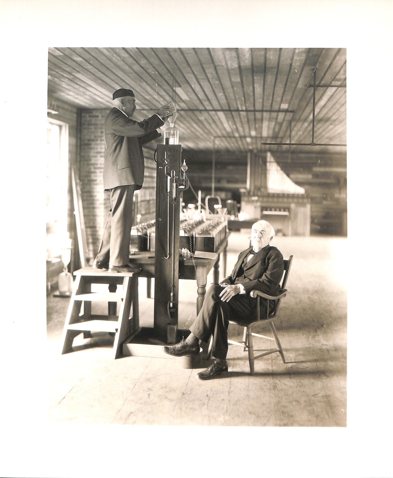 Thomas Edison and Francis Jehl with Sprengel pump at reconstructed Menlo Park lab in Dearborn, Michigan.