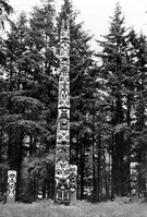 Totem poles on Sitka fort site, Sitka National Historical Park. (Frog Woman)
