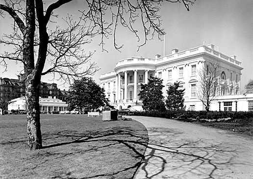 Northwest view of the south front of the White House. The area on the left, occupied by temporary buildings during the renovation, has been resodded, and the West Garden replanted and resodded. White House restoration project.