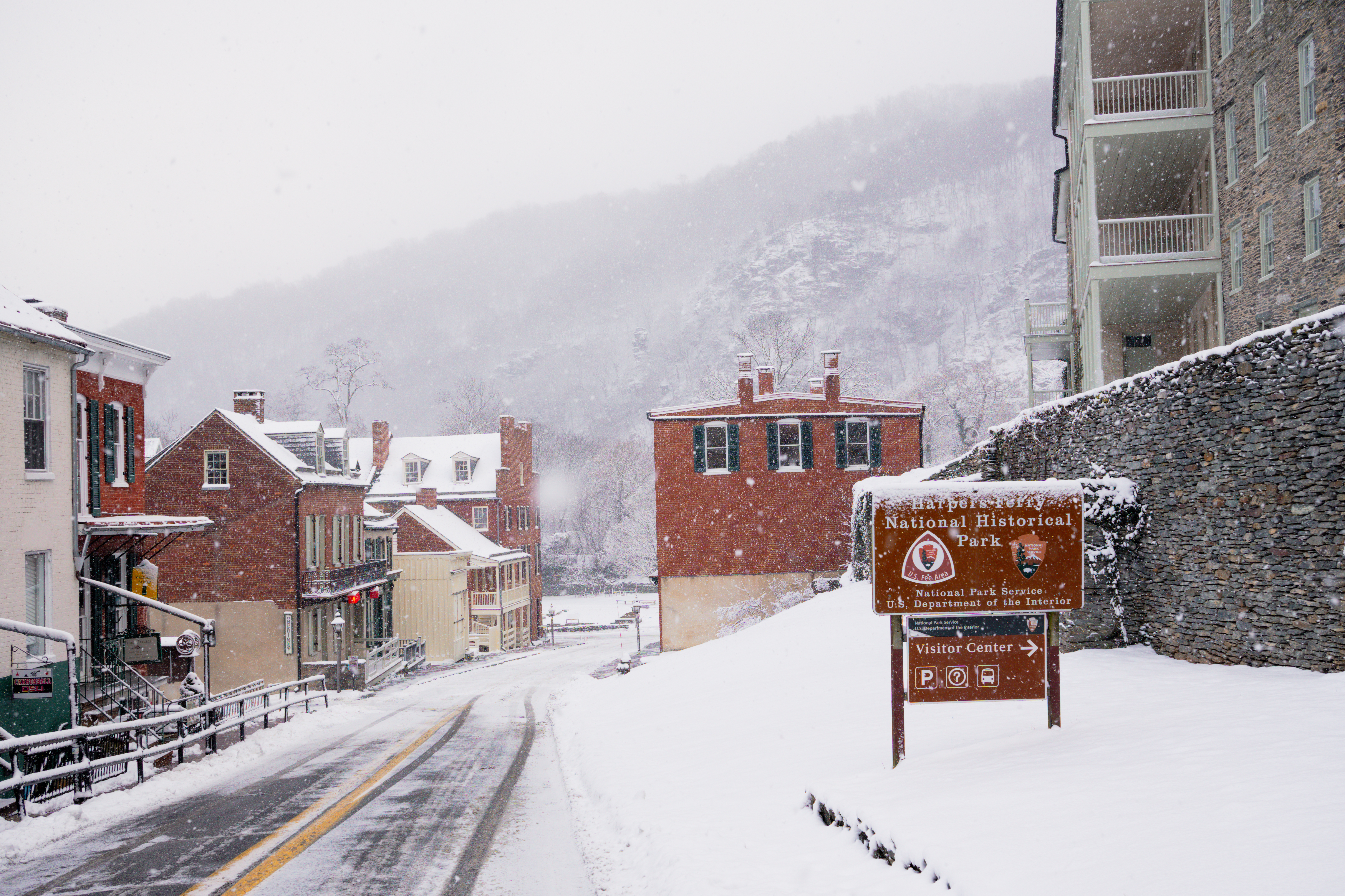 Heavy snowfall begins to cover an entrance sign to Harpers Ferry National Historical Park in West Virginia, with the buildings of Lower Town behind it. In the background, the Blue Ridge is barely discernable.