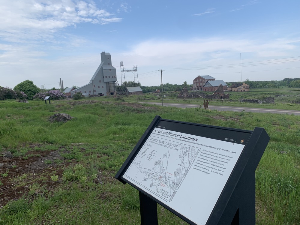 A wayside that reads" A National Historic Landmark" as the title and features a map of the area is in the foreground of the image with the "Three Miners Walking" and mining buildings in the background.