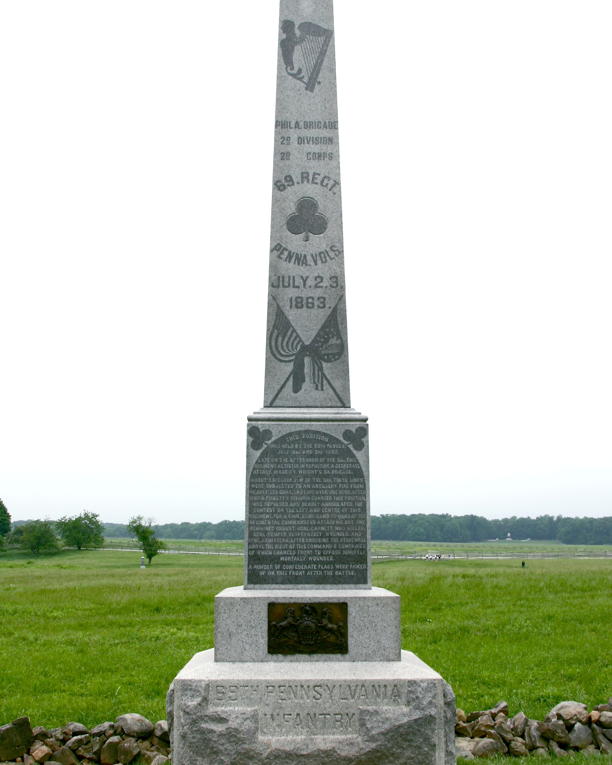 1 of 110 Monuments to Pennsylvania. Indicates position of 69th PA Infty Jul 3, 1863. Line of granite posts designates co's. A-K place line. Located S side Webb Av. W of Copse. || Mn & 10 Co. Markers. Mn: 5'6"sq, rough-cut, incised inscrip. 3 part shaft w/ finished & polished stone w/ 3rd part obelsik. Bronze tablet missing. 10 co. markers 1'sq x 2'-3'H. Chains between co. mkrs re-installed. ERO noted @ Co. K mkr.