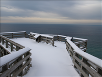 View of snow covered dunes and bluffs and Lake Michigan