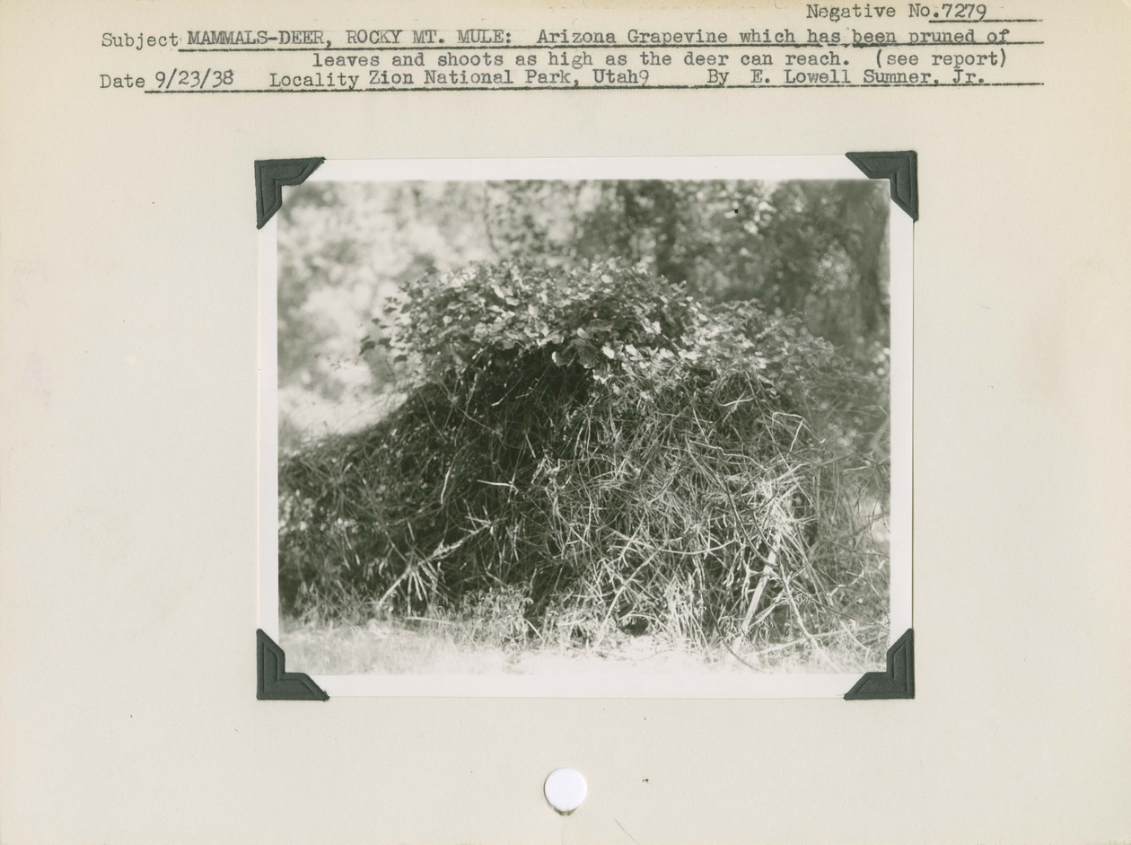 Mammals- Deer, Rocky Mountain Mule: Arizona grapes which has been pruned of leaves and shoots as high as the deer can reach. (see report). Negative #: 7279. Locality: Zion National Park, Utah.