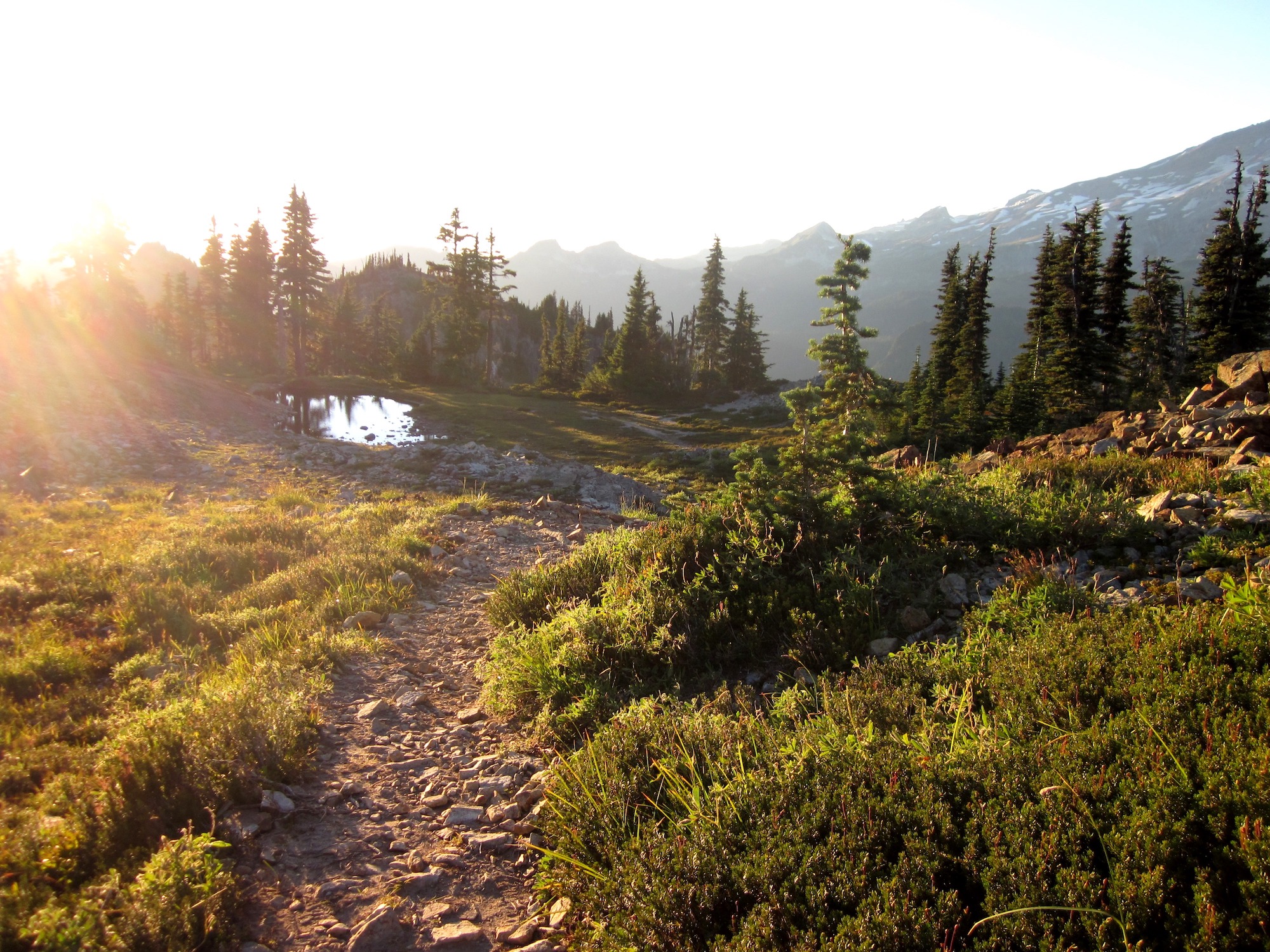 A rocky trail leads through a sub alpine meadow with low angle light shining through trees.