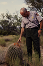 NPS employee pointing towards a flower on top of a cactus.