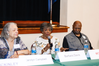 An older african american panelist in a white shirt with lemons and leaves on it speaks into a microphone while seated behind a green table and a table tent reading barbara davis