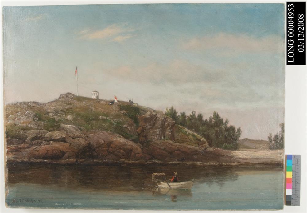 RECTANGULAR VIEW OF A ROCKY HILL W/ BAY ACROSS FOREGROUND. SMALL WHITE GAZEBO, FLAGPOLE AND 3 FIGURES PERCHED ATOP HILL; MAN IN ROWBOAT AT BOTTOM TO RIGHT OF CENTER. UNFRAMED.<CR<CRLISTED BY HWL IN HIS MANUSCRIPT INVENTORY "Paintings in Craigie House", P. 33.