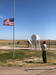 Man in a park service uniform of gray shirt and green pants saluting the US flag flying at half mast.