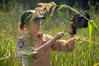 A young woman in green ball cap and khaki uniform holds a circular black device in her hands. Her field notebook sits to her right.