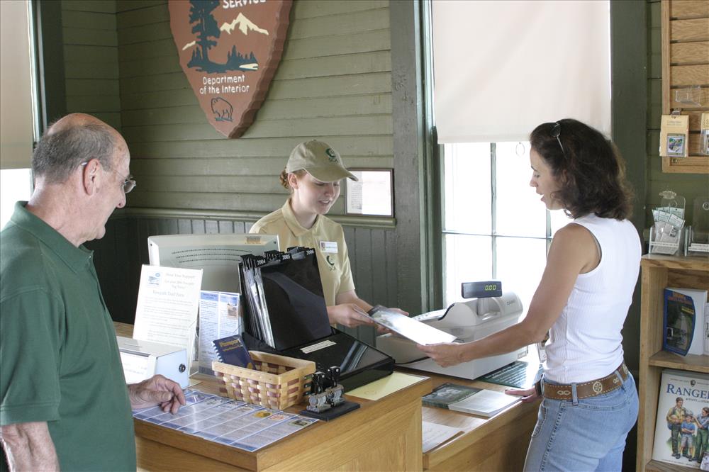 A Student Conservation Association (SCA) intern talks to visitors inside the Peninsula Depot. || Peninsula Depot Visitor Center is an information/orientation facility developed to help visitors explore Cuyahoga Valley National Park, Cuyahoga Valley Scenic Railroad, the historic Village of Peninsula, and the Ohio & Erie Canalway.