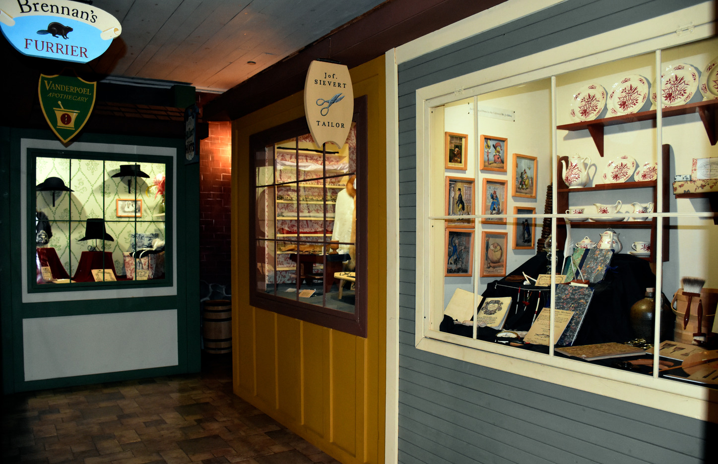 A dark corner with three illuminated windows. One shows dishes, fancy books, and small illustrations. Another shows fabrics, and the third various historic hats.
