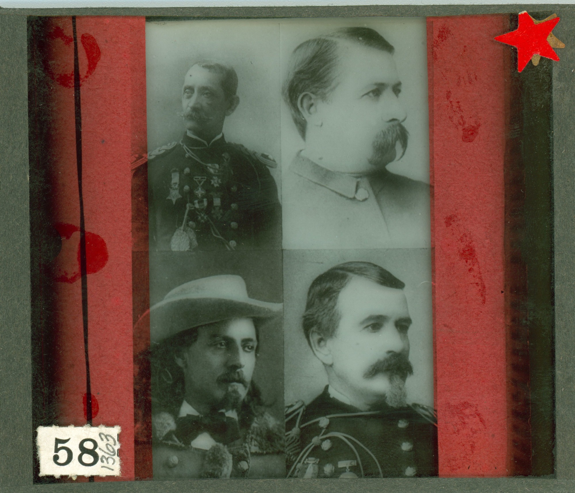 LIBI_00030_01363; A lantern-slide (glass transparency), "Captain Henry, McKenzie, Buffalo Bill, and Powell". This is a collage of four mounted photographs of (left to right, top to bottom): Captain Henry, McKenzie, Buffalo Bill, and Powell. It was produced by an unknown photographer on an unknown date. [Bowen No. 58.]; transparency, latern-slide [photographic material]; Courtesy of the National Park Service, Little Bighorn Battlefield National Monument, LIBI_00030_01363, Unknown Photographer, "Four Portraits (Left to Right, Top to Bottom): Captain Henry, McKenzie, William F. Cody, and Powell," date unknown