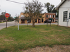 A leafy crape myrtle tree stands in an area of turf on a street corner, near several one-story structures including the Train Depot to the right.