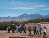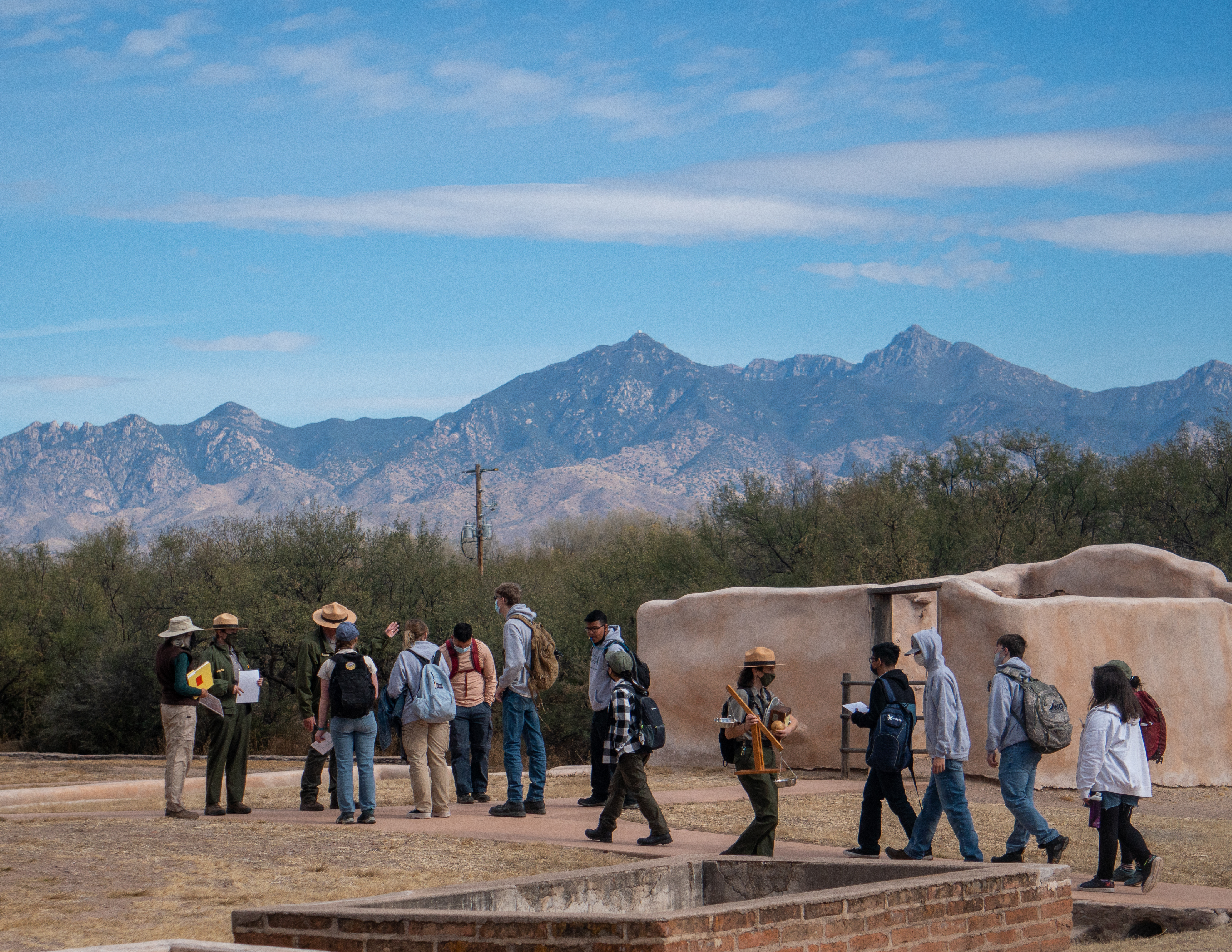 A group of students and Park Service employees stand near an adobe building wearing masks