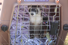 a ferret in a cage packed with shredded paper looks out as it waits to be released