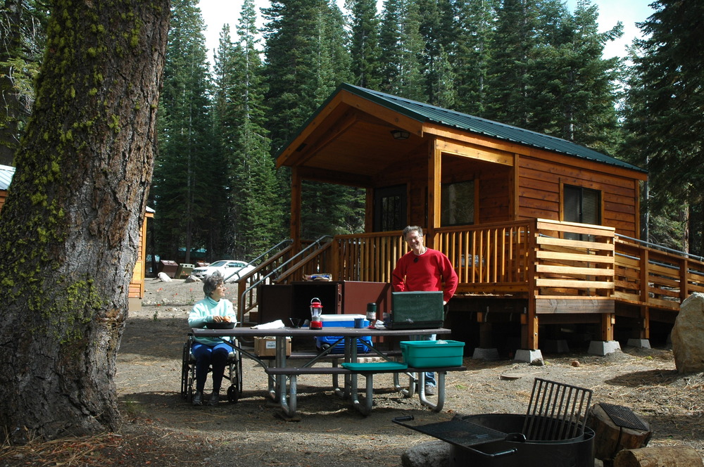 Two campers at a picnic table near a cabin , one in a wheelchair, enjoying camping at the Manzanita Lake Campground.