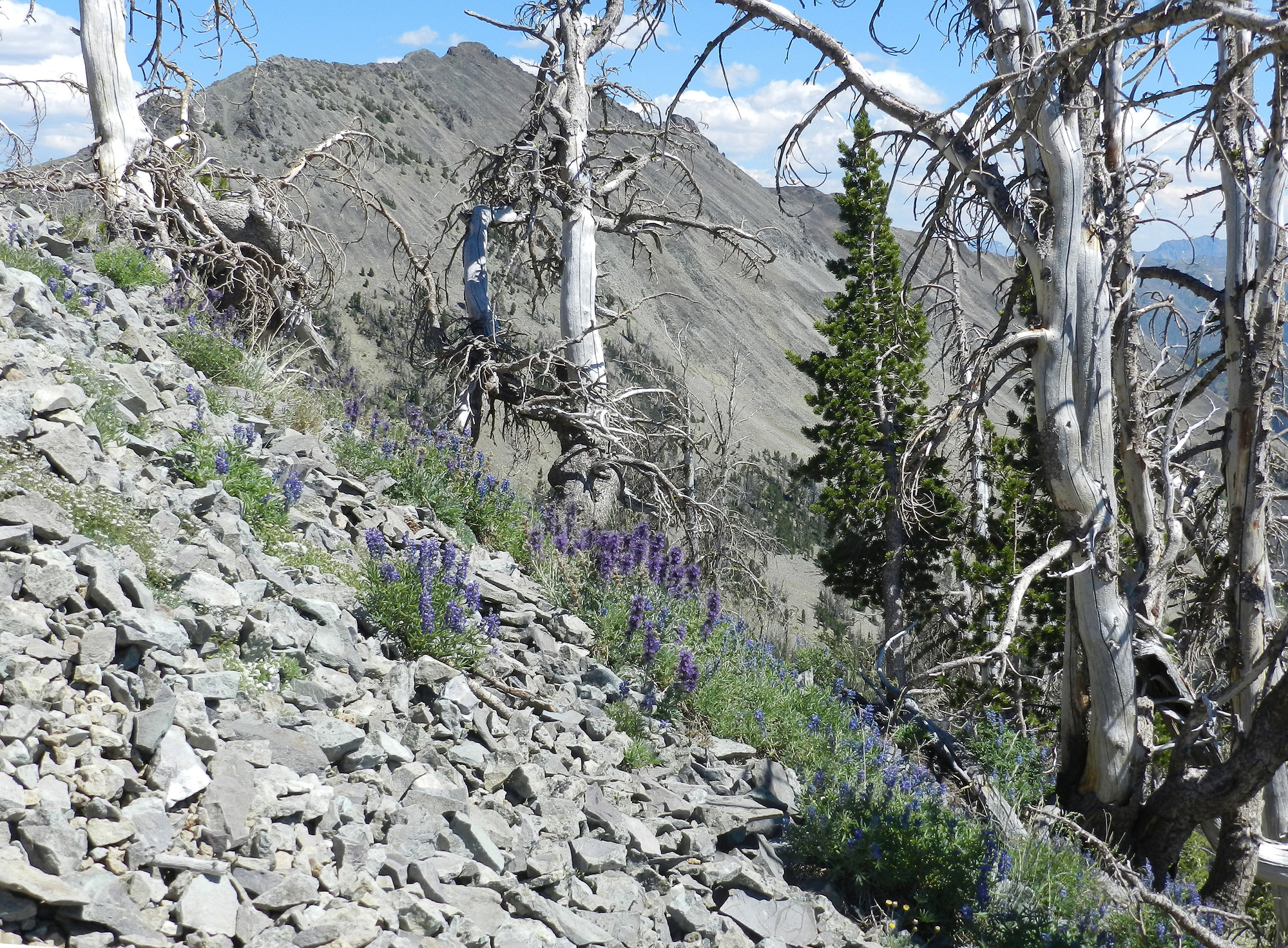 Looking past a rocky slopes with purple flowers on it to a steep sided mountain in the distance.