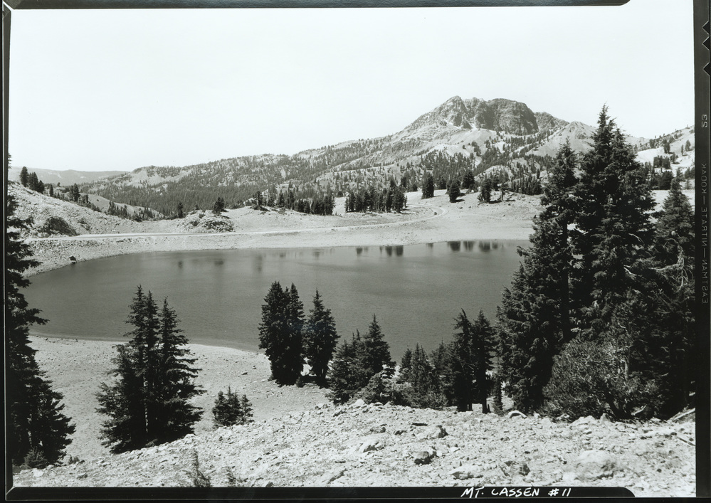 Lake Helen at foreground, unpaved park highway at center, and Brokeoff at top right. . Previous filename lavo11.jpg