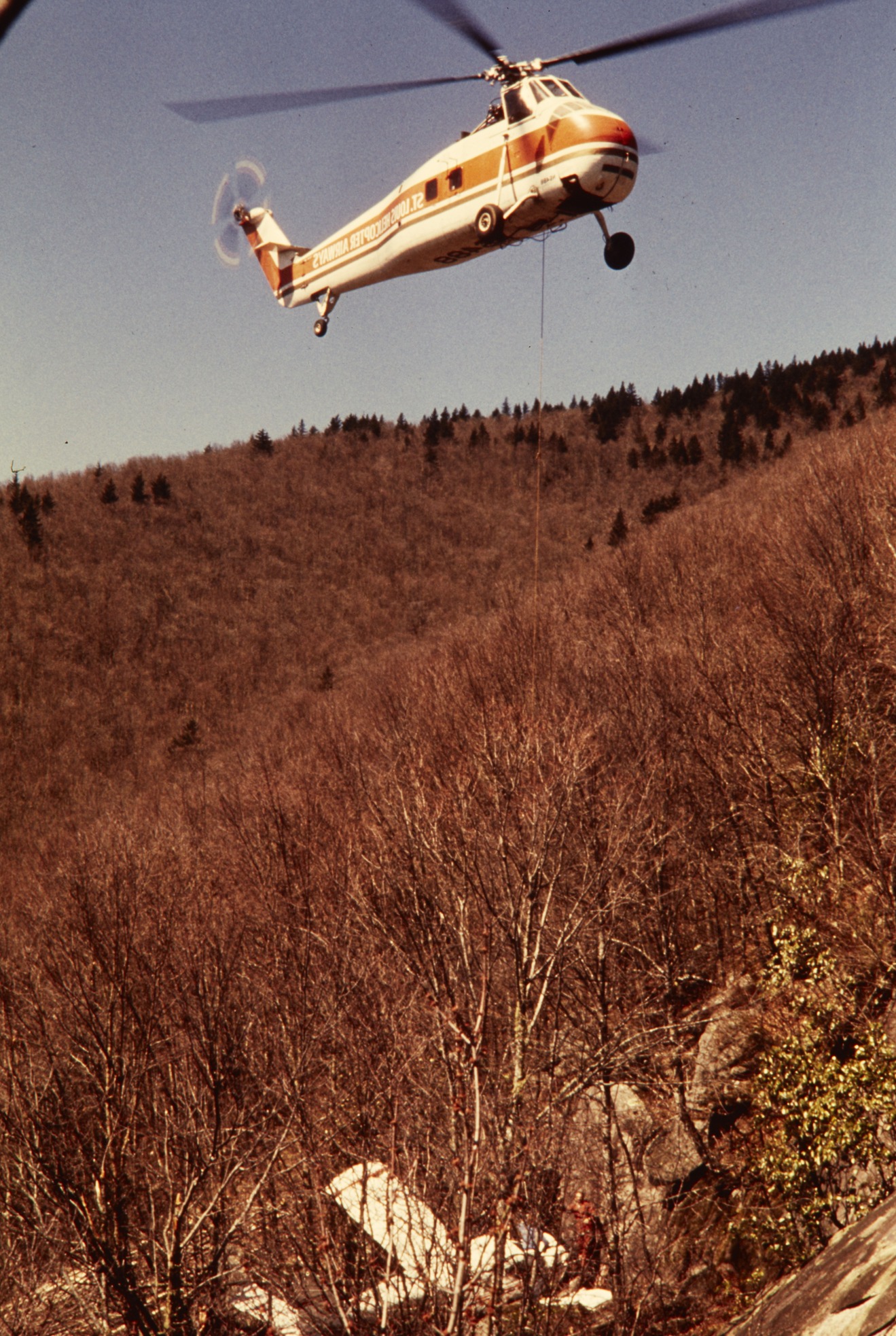 Helicopter flying over a plane crash for a rescue in Great Smoky Mountains National Park.