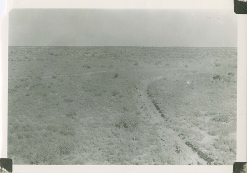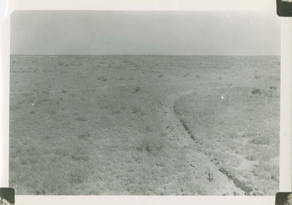 Contour furrowing. Foreground: close up view of contour furrowing with native seeding in furrows. Notice break in furrow to prevent erosion in furrow. Background: general view of contour furrowed hillside. Picture taken about 500 feet northeast of upper culvert at east end of section C of the new road. Locality: Chaco Canyon National Monument. No negative on file