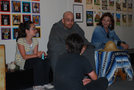 A bald man with a beard and glasses speaks to an older woman with long brown hair and two kids