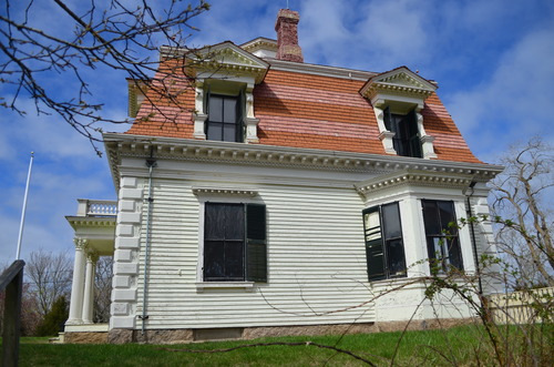Penniman house with peeling paint and faded stain, deteriorated and missing shutters, chimney needs flashing and repointing.