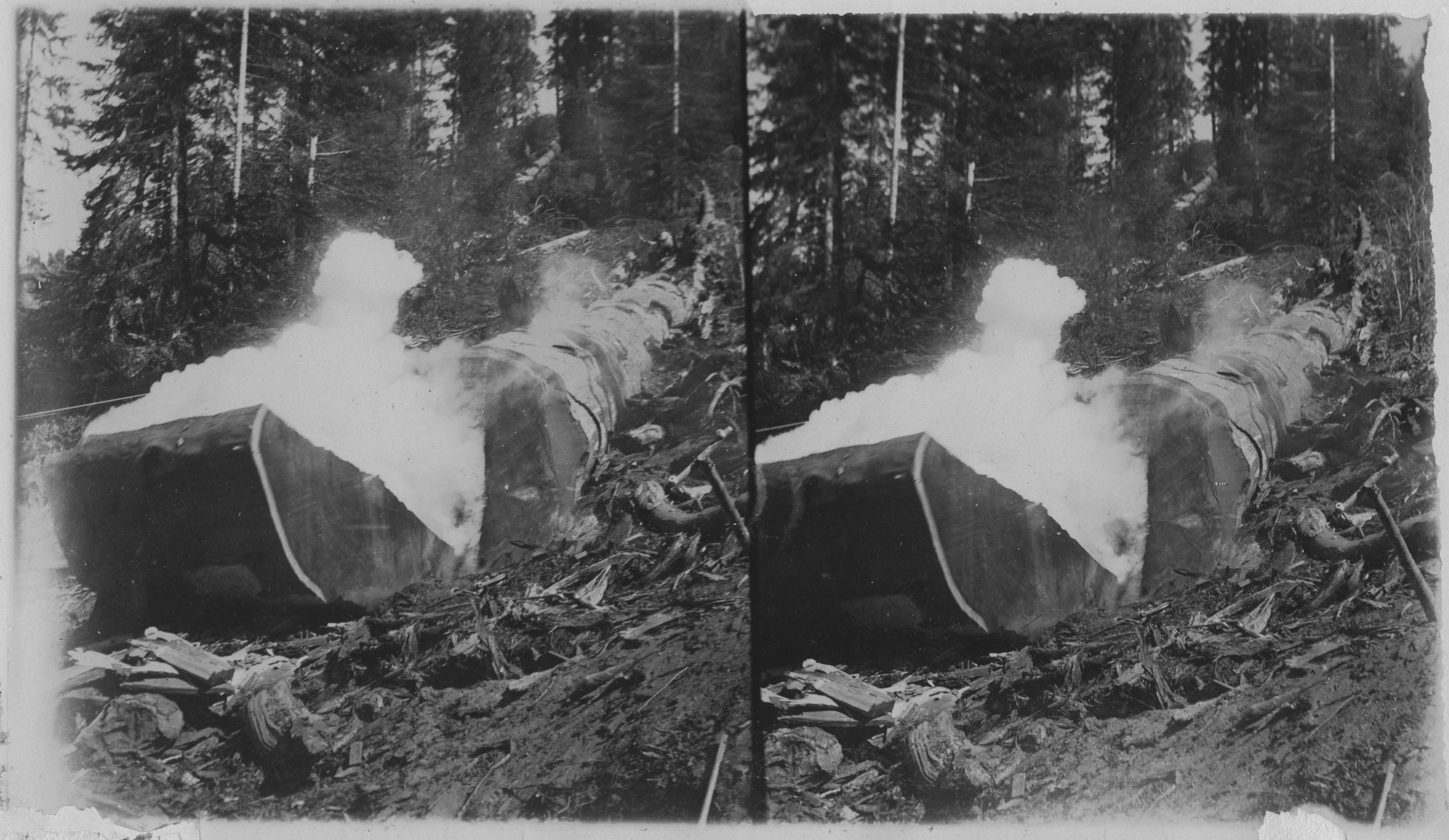 This is a stereoscopic view, but must be cut apart and transposed in order to get the effect, as you probably know. In order to blast the logs deep holes were bored along the top of the log. A charge of "Giant powder" was placed in th bottom then a charge of black powder next. The force of the giant powder was down while the blac tended to split the log open. This was a perfect shot but some of the pictures I took of the same operation the log did not split but slivered and wasted half the lumber or more. No 11