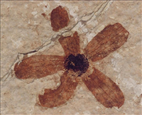 Fossilized plants are much more difficult to identify than living plants because their delicate parts often become separated before they are preserved. The detailed preservation of this unidentified flower is due in part to the fine-grained nature of the limestone matrix in which it is found.