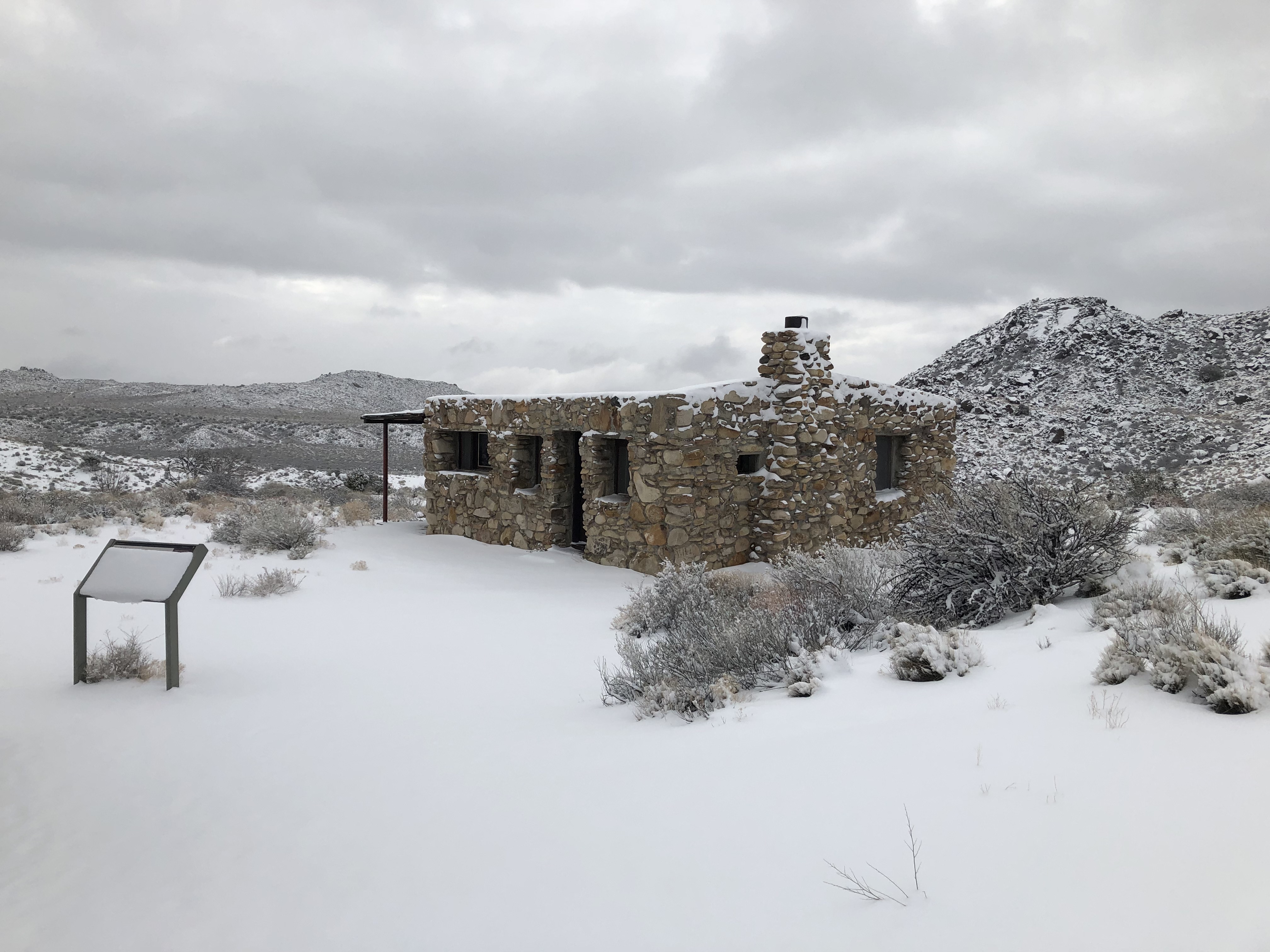 A snow-dusted rock cabin, with snowy bushes surrounding it.