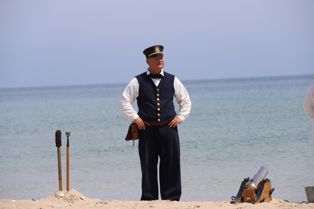 Keeper Matt in his navy-blue uniform stands heroically with his trusty, lifesaving Lyle Gun to one side and tools to the other. The blue waters of Lake Michigan stretch to the horizon behind him.